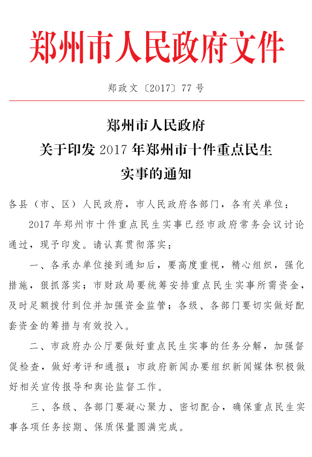 2017 年郑州市十件重点民生实事