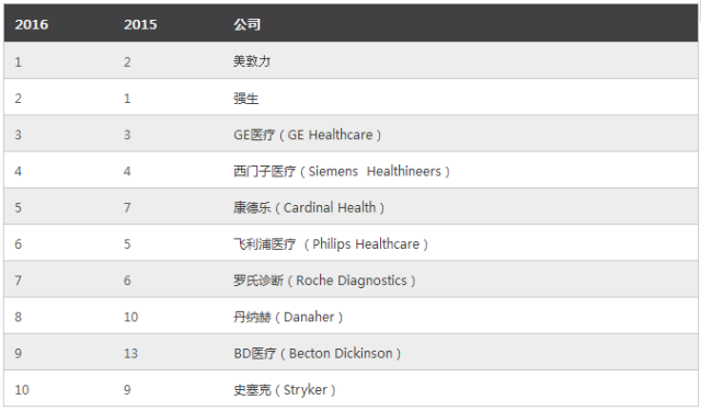 康德乐和丹纳赫均较去年上升了两个名次。而BD医疗则从去年的13名上升4位坐到第9的位置——首次进入Top10的阵营。和美敦力相似的是,BD医疗在榜单中的优异表现受益于一项数额巨大的收购交易,即其于2015年3月完成的对药物管理和患者护理公司CareFusion的价值122亿美元的收购。BD医疗2016财年截止于2016年9月30日,因而业绩中包括了收购CareFusion以来第一个完整财年的收入——进而将该公司2016财年与医疗器械相关的收入提高到99.6亿美元,比2015财年多了22亿美元。