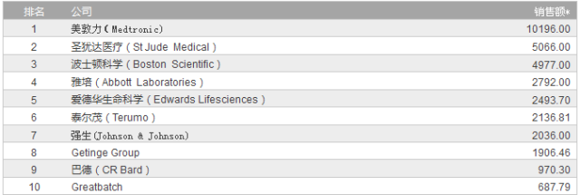 注1:表中所示销售额为各公司2015财政年度或截至2016年12月1日的最近一个财政年度的心脏病学医疗器械相关收入,单位为百万美元。