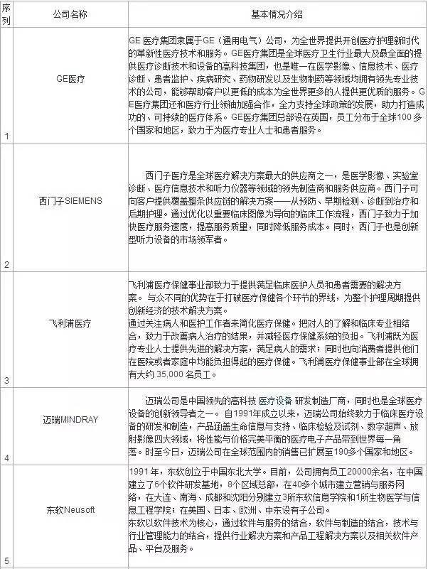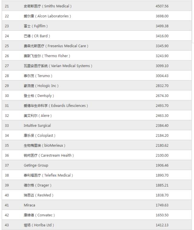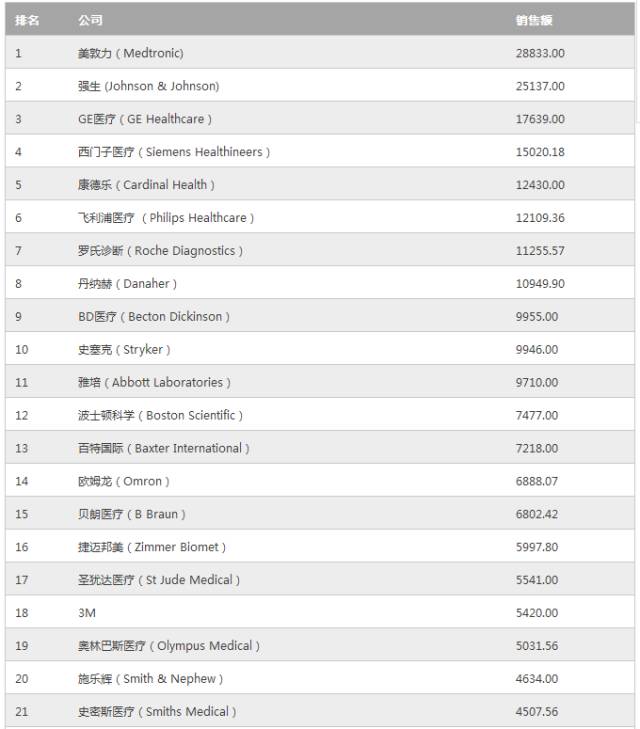 注1:表中所示销售额为各公司2015财政年度或截至2016年12月1日的最近一个财政年度的医疗器械及诊断设备相关收入,单位为百万美元。