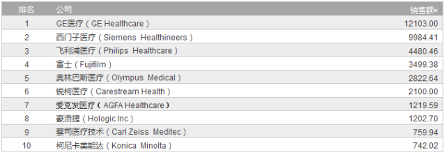 注1:表中所示销售额为各公司2015财政年度或截至2016年12月1日的最近一个财政年度的影像医疗器械相关收入,单位为百万美元。