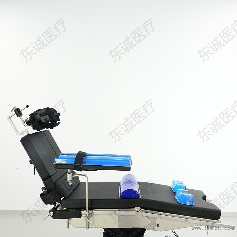 二、应用:用于肩部开刀手术开展,边轨插接方便安装,左右肩部可拆卸展开相关手术,头托可以360度万向调节、高度调节0-300mm、背部与床体采用进口气弹簧调节角度,外形尺寸500x550mm,配有转运台车方便拆卸。
