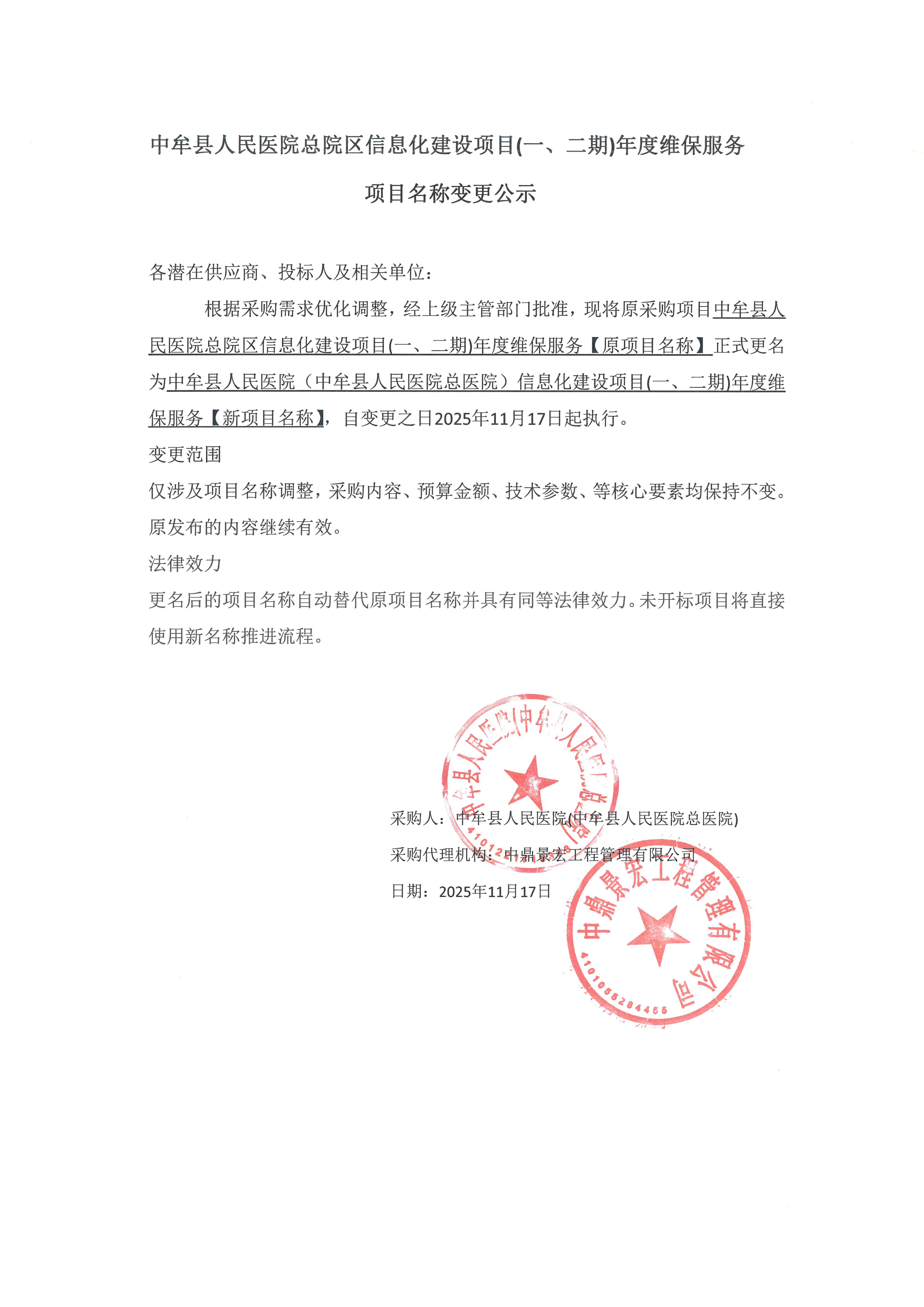 | 根据采购需求优化调整,经上级主管部门批准,现将原采购项目中牟县人民医院总院区信息化建设项目(一、二期)年度维保服务【原项目名称】正式更名为中牟县人民医院(中牟县人民医院总医院)信息化建设项目(一、二期)年度维保服务【新项目名称】,自变更之日2025年11月17日起执行。 变更范围: 仅涉及项目名称调整,采购内容、预算金额、技术参数、等核心要素均保持不变。 原发布的内容继续有效。 法律效力: 更名后的项目名称自动替代原项目名称并具有同等法律效力。未开标项目将直接使用新名称推进流程。 |